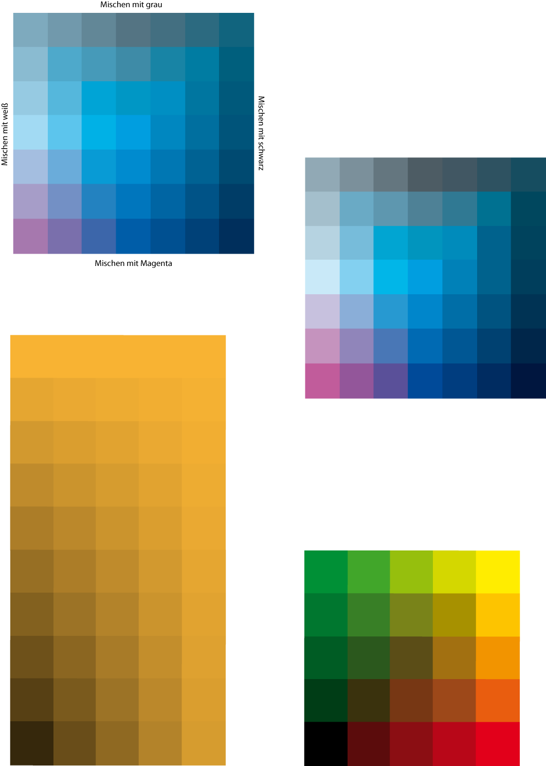 Gegenüberstellung gesättigter (reiner) mit ungesättigten Farben (schwarz oder weiß beigemischt)